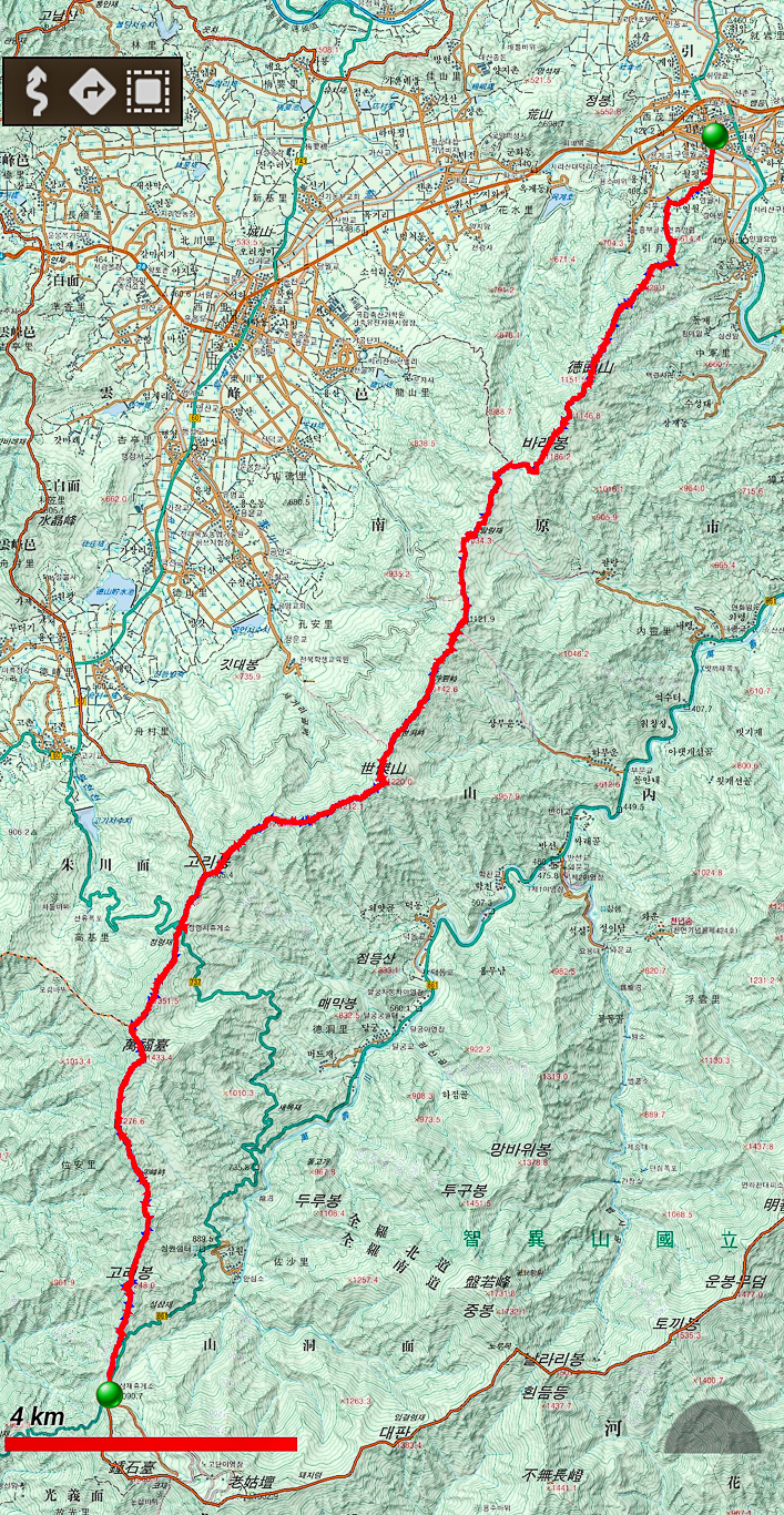 지리산 서북능선은 성삼재에서 고리봉, 묘봉치, 만복대, 정령치, 세걸산, 세동치, 부운치, 팔랑치, 덕두봉을 거치는 해발고도 최고 1420으로 1000m 이상이며 역시 23km 정도의 긴 능선을 말합니다.