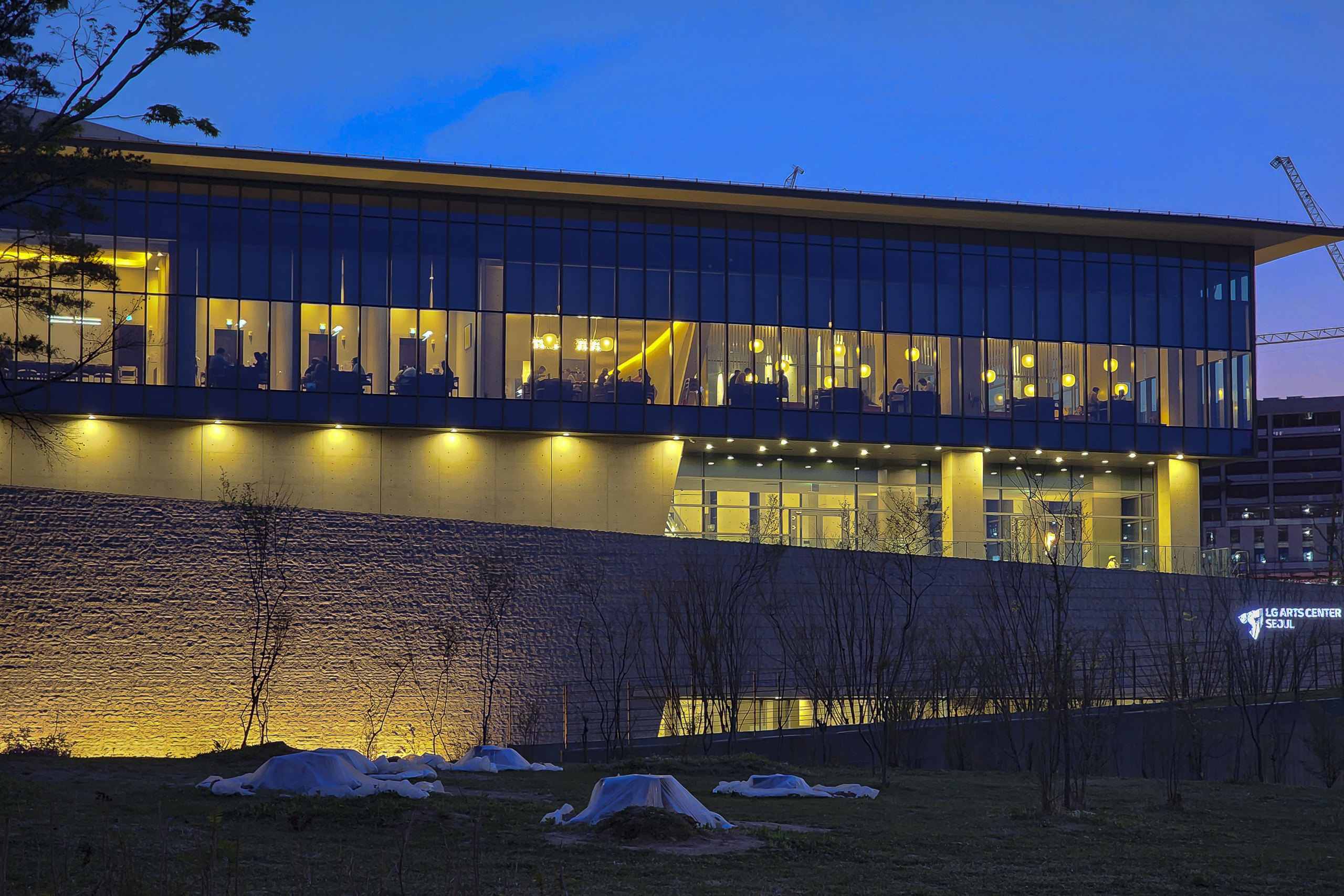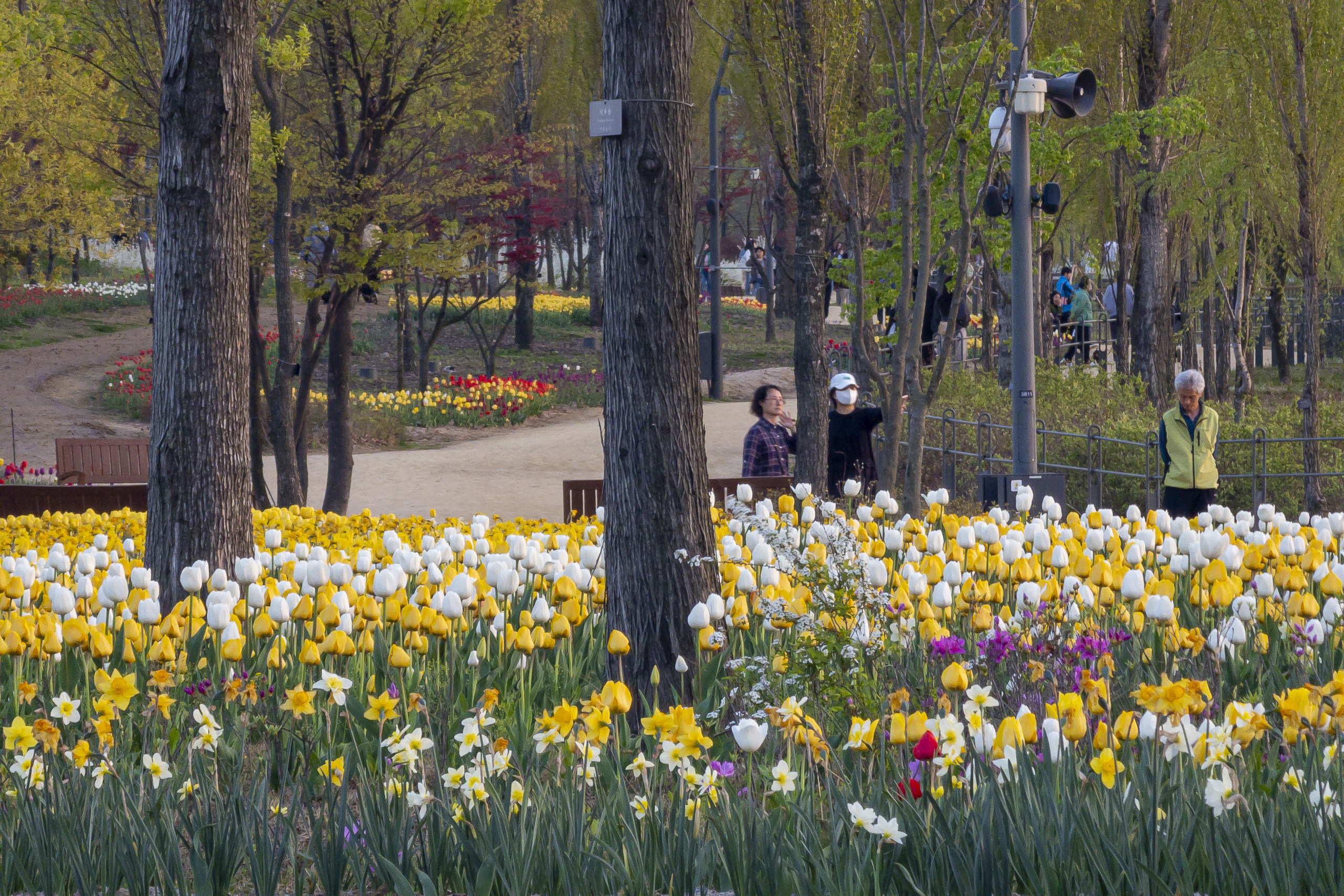 딸기꽃, 분꽃, 튤립, 수선화 그리고 LG아트센터와 식물원 입구 빌딩들.